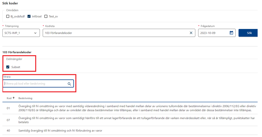 Efter att du har bockat i en delmängd finns det möjligheten att filtrera på kod eller beskrivning.